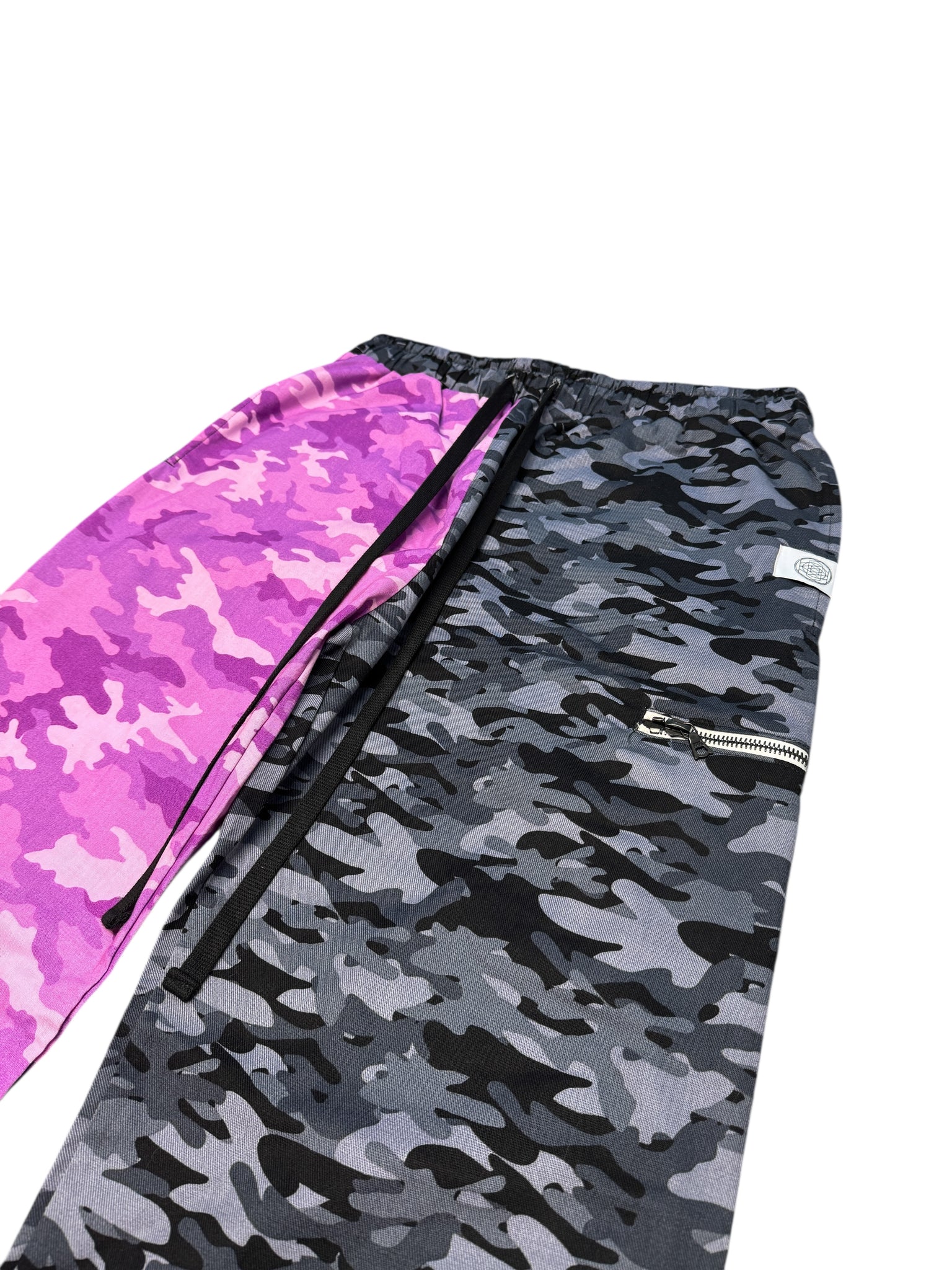 Crafted from two contrasting cotton camo prints, finished with a relaxed baggy fit and zip detail. Size M/L 32” elastic waist w/ drawstring.