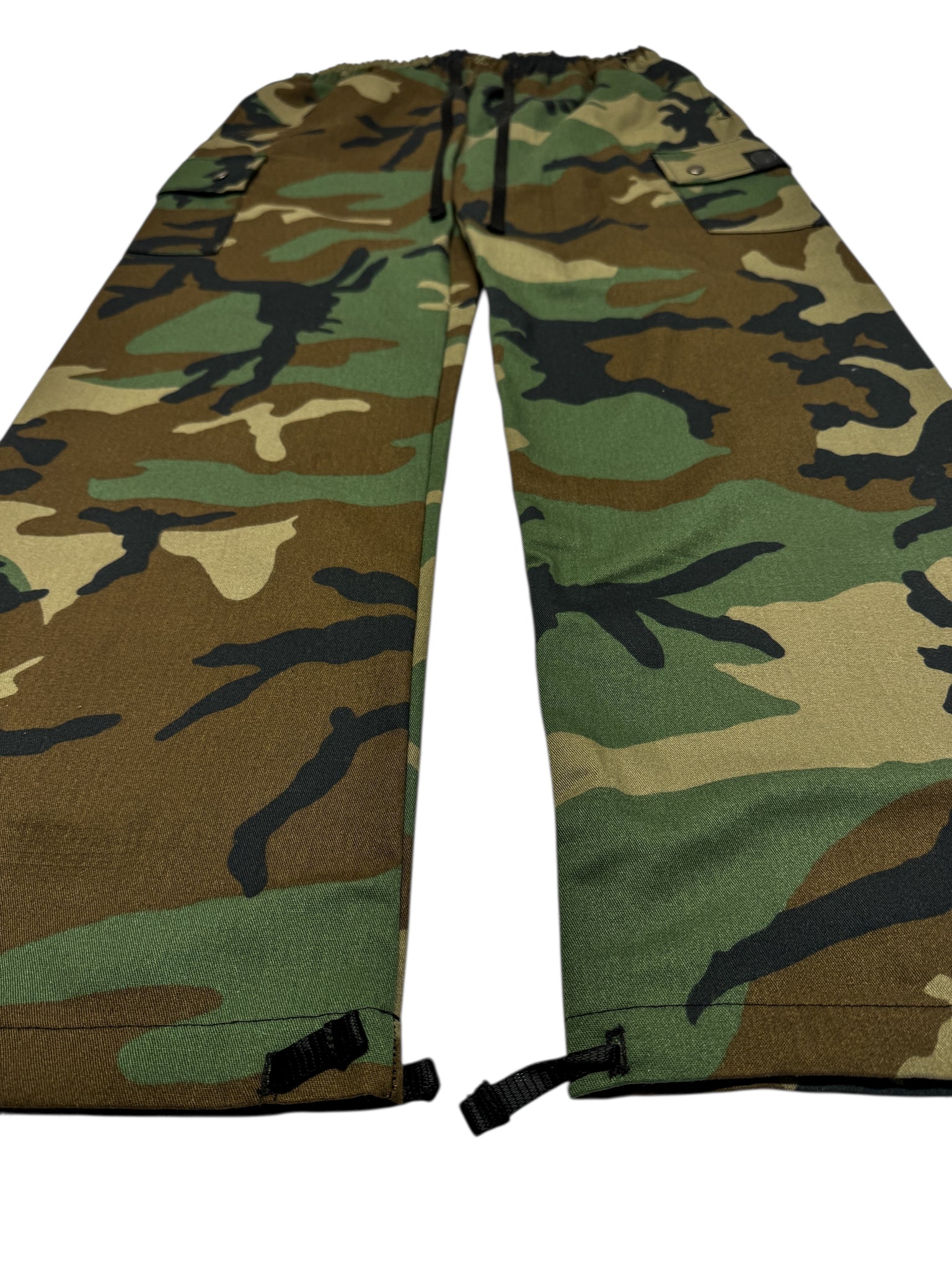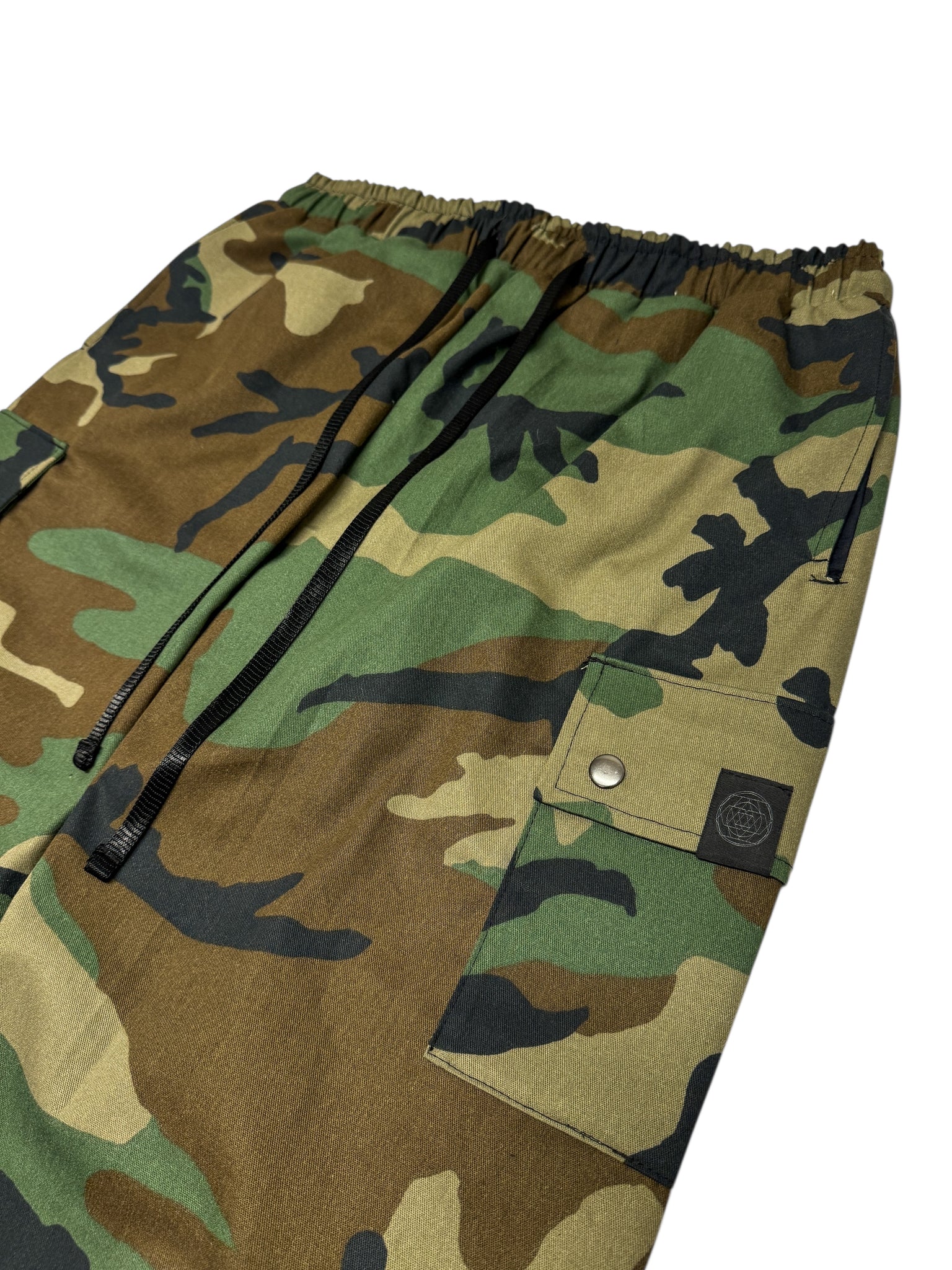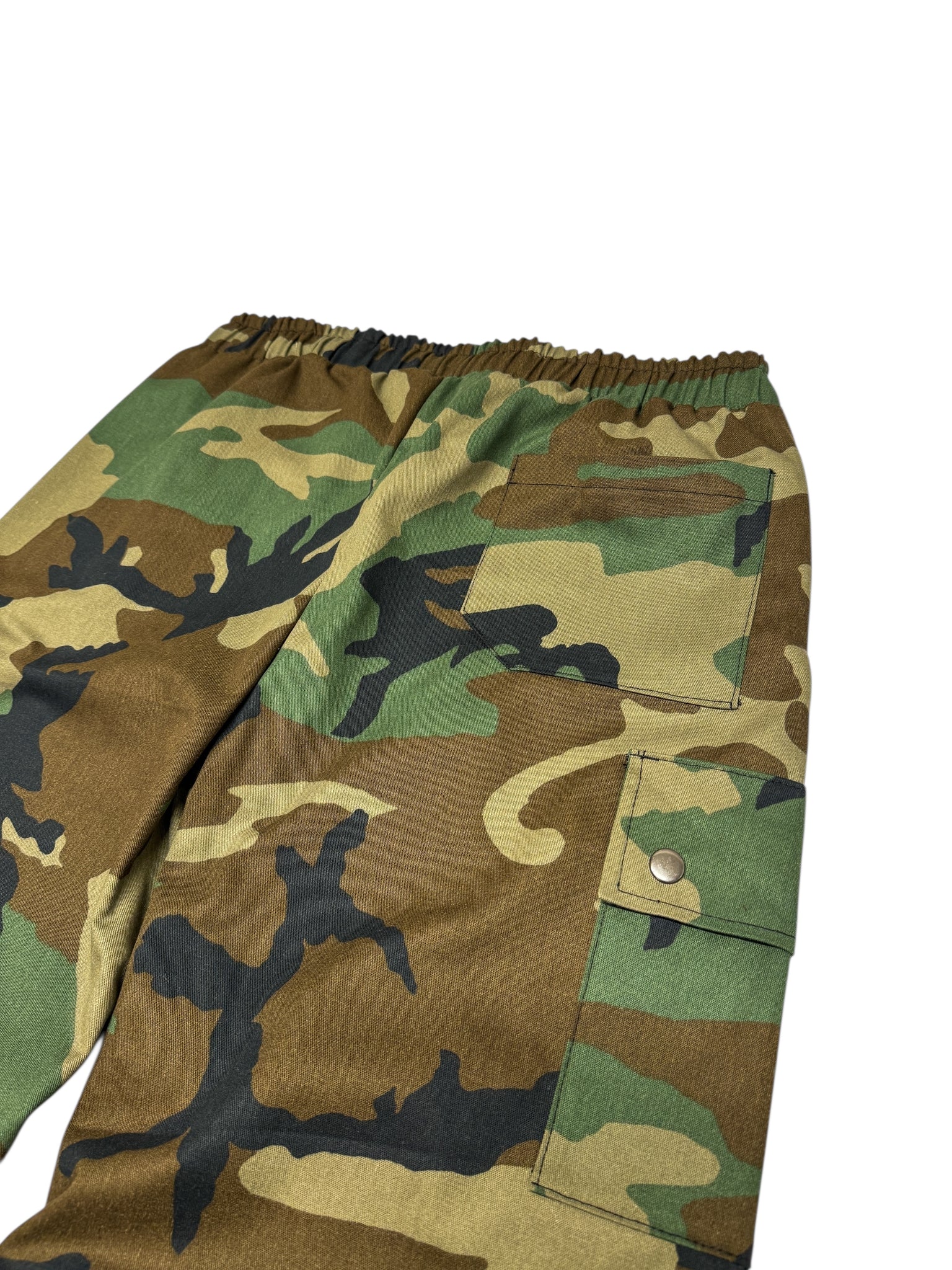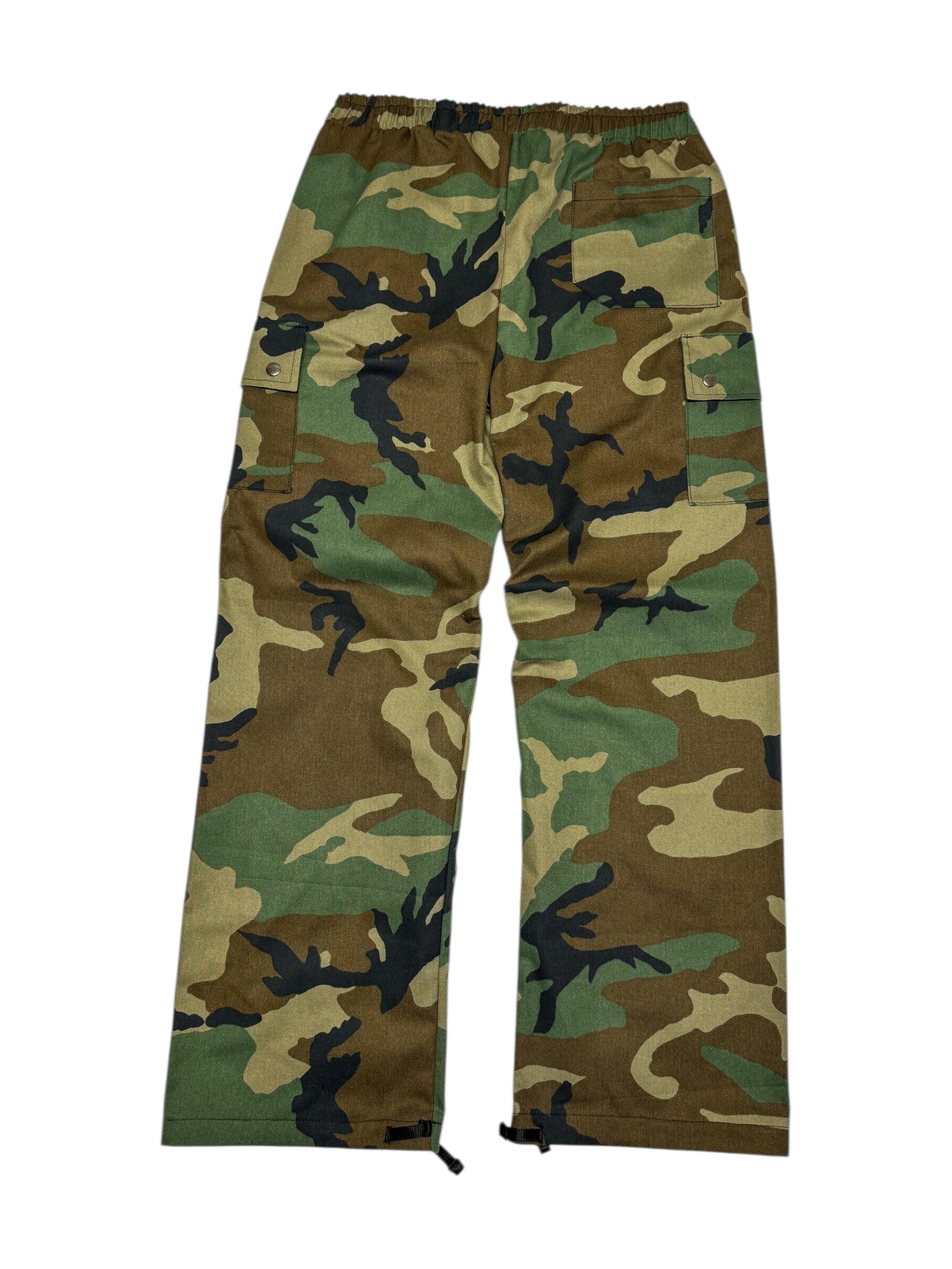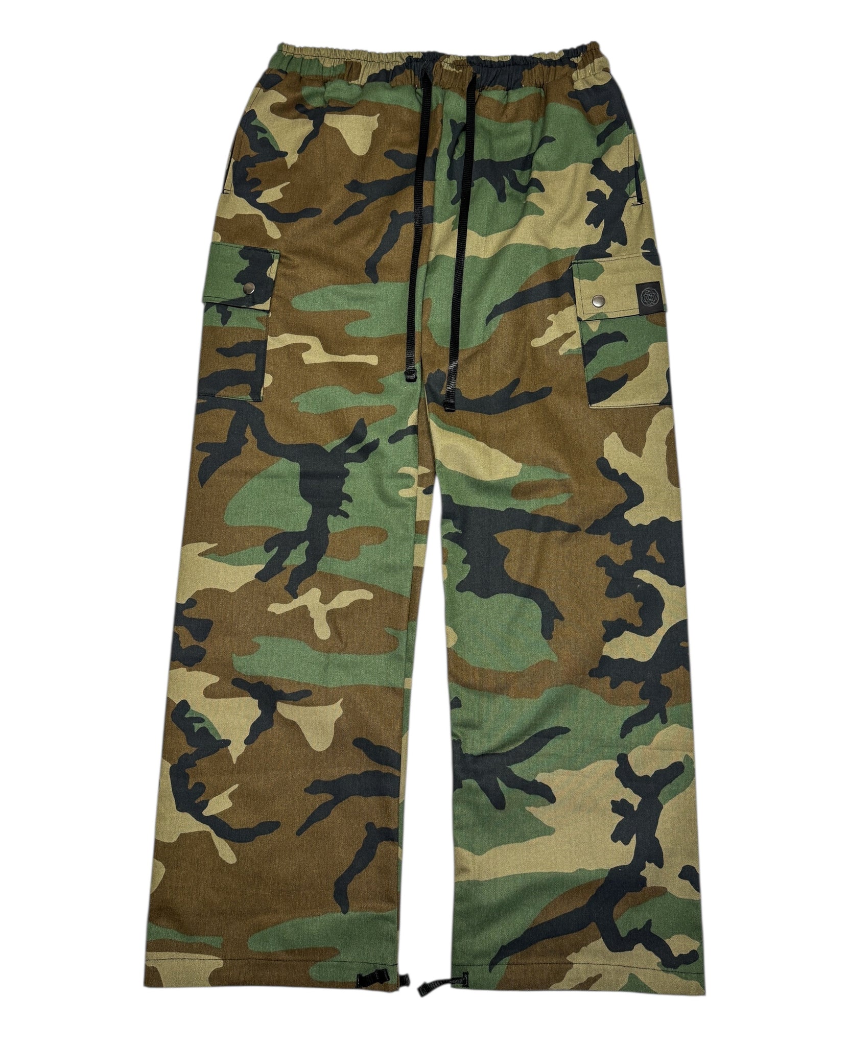 Our new souljah camouflage cargo pants. Heavy duty twill fabric. Keep all your goods secure in the deep hand pockets, side cargo pockets, or back pocket. For an adjustable fit they have an elastic waist with drawstring as well and ankle ties.