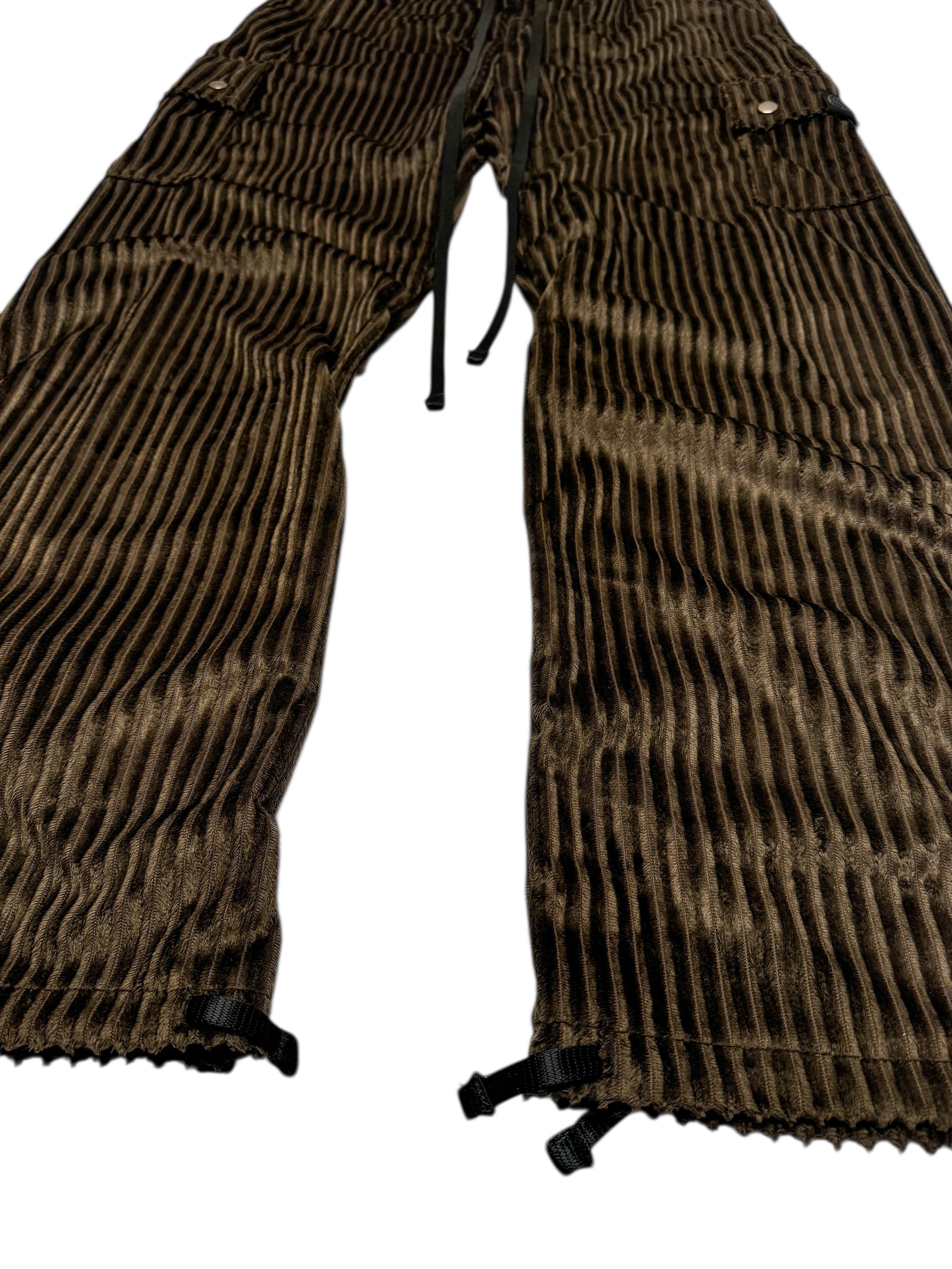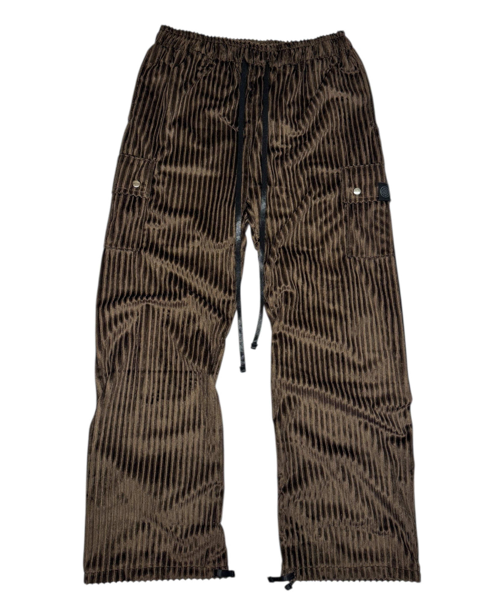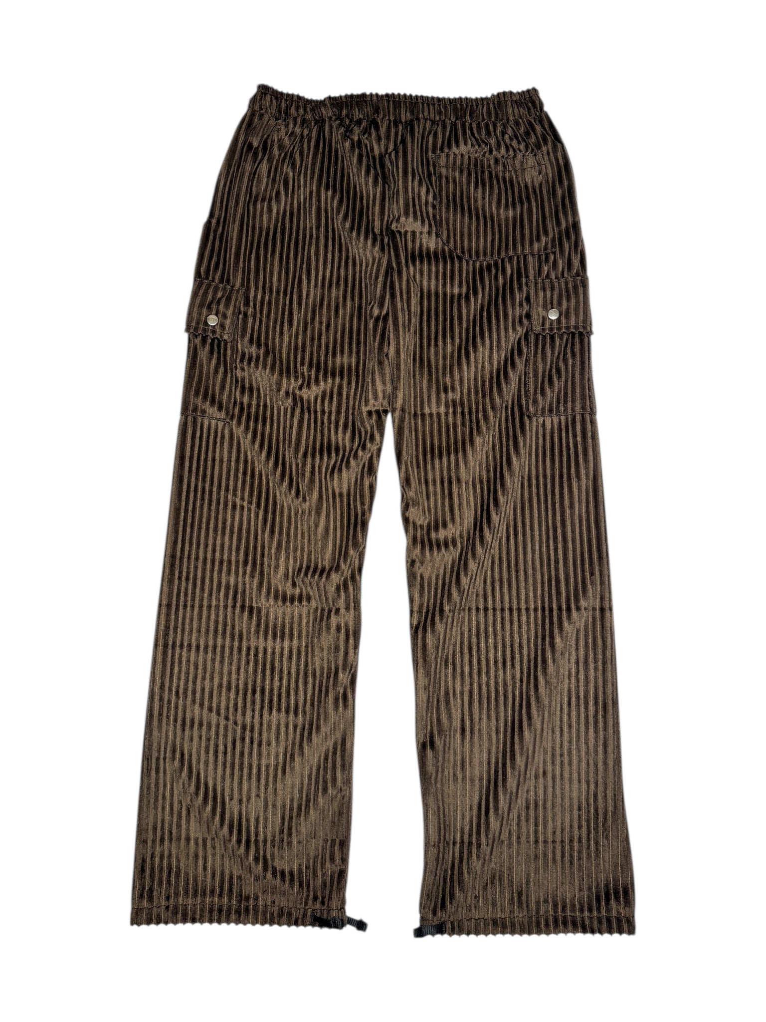 Our new chocolate elephant cord cargo pants. Made from a super cozy velvet corduroy. Keep all your goods secure in the deep hand pockets, side cargo pockets, or back pocket. For an adjustable fit they have an elastic waist with drawstring as well and ankle ties.