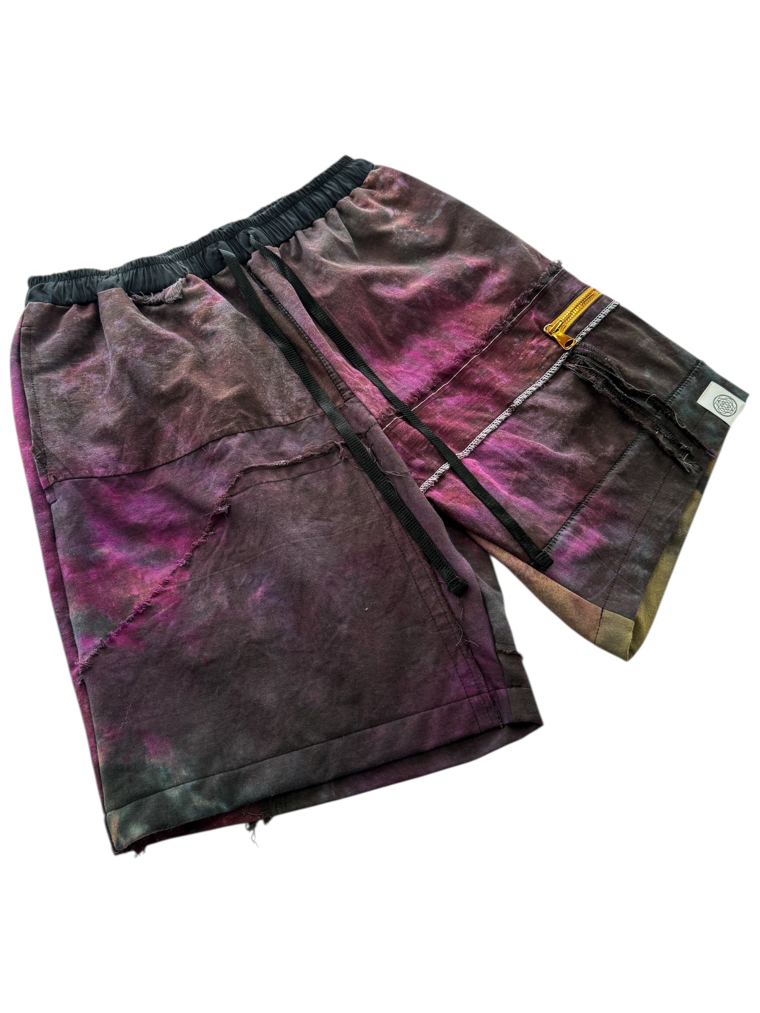 The one of a kind Purple Moss shorts are made from a cotton mixture that has been custom dyed, and then chopped and patchworked into shorts. Keep your goods secure in the deep hand pockets, back pocket, or side zipper pocket. Size medium 30-32” elastic waistband with drawstring.