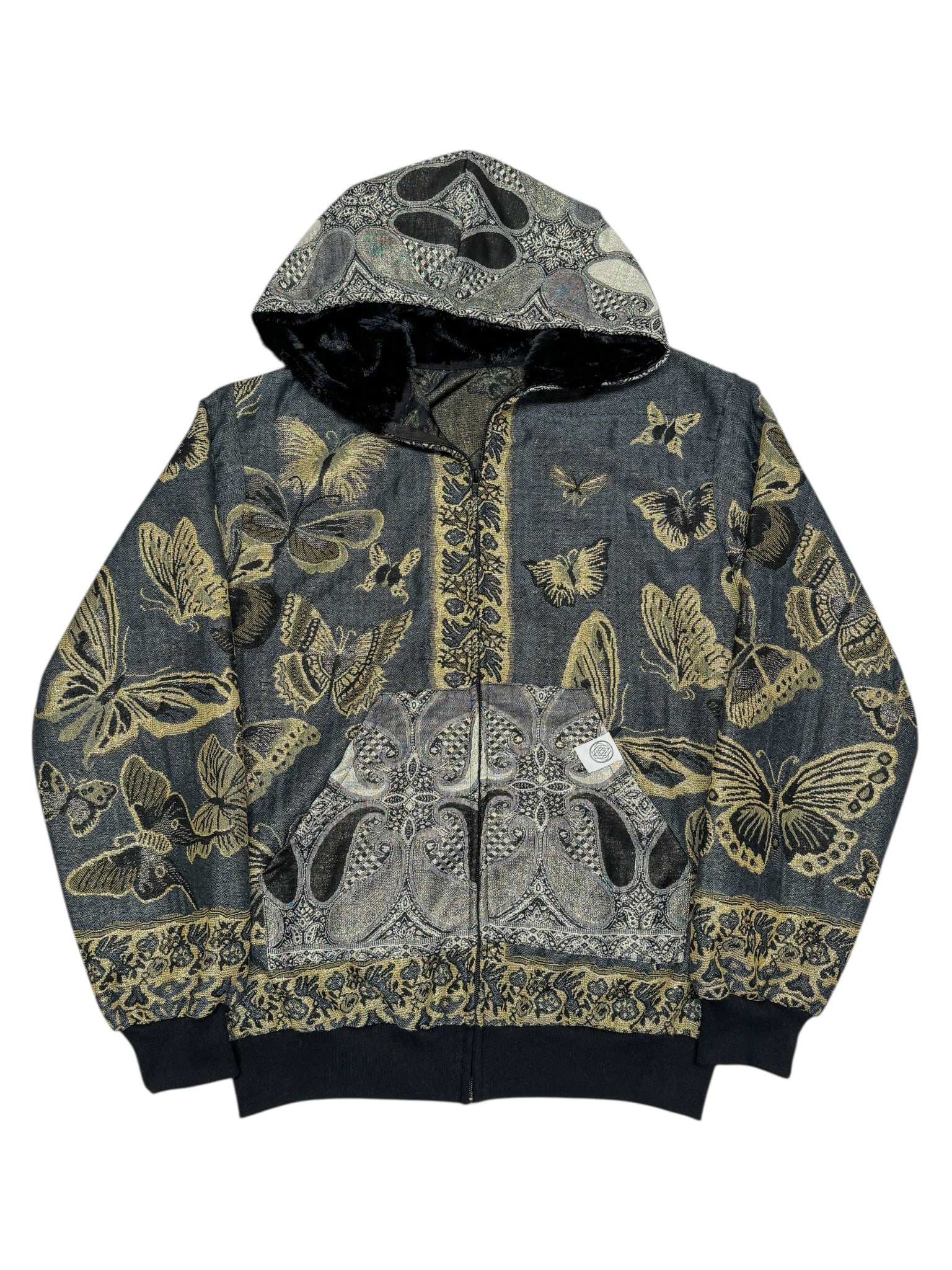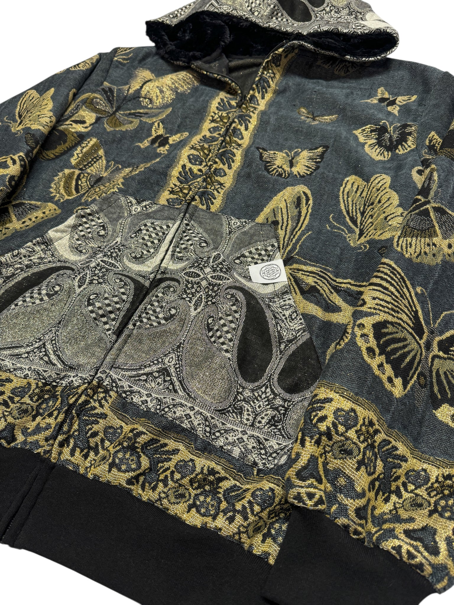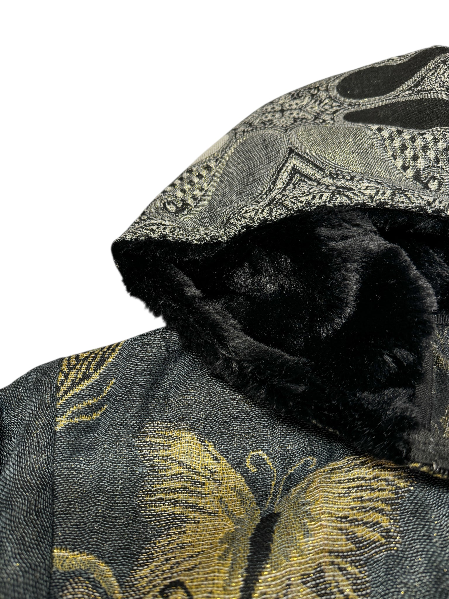 All of our pashmina hoodie are one of a kind or limited edition. Made with our PashTek backing for added strength. Each hoodie has a zip up front and plush fur lined hood.