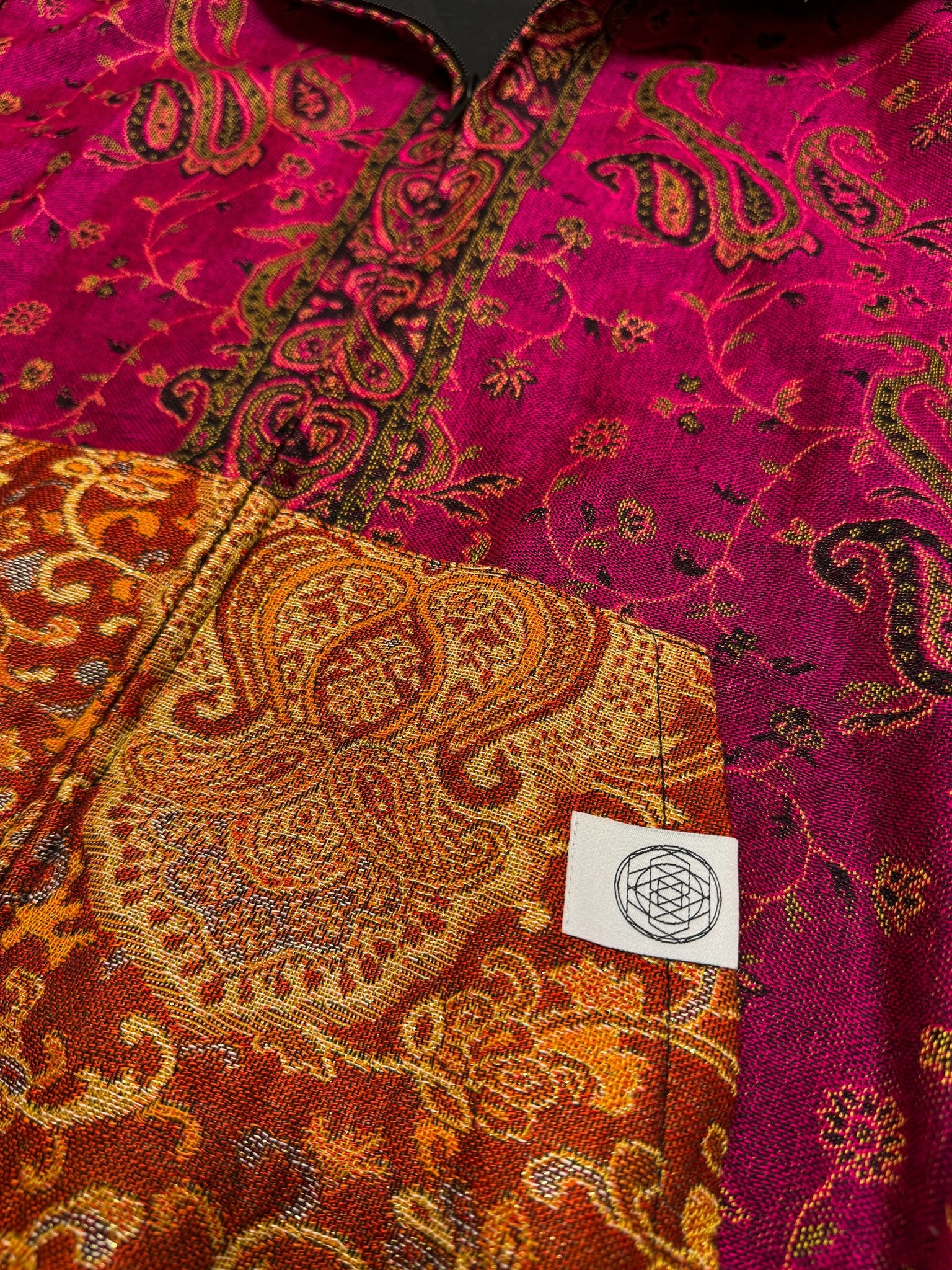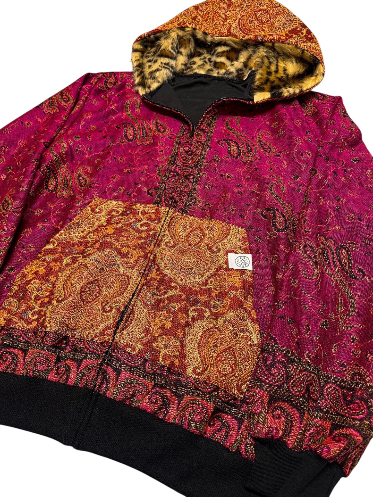 All of our pashmina hoodie are one of a kind or limited edition. Made with our PashTek backing for added strength. Each hoodie has a zip up front and plush fur lined hood.