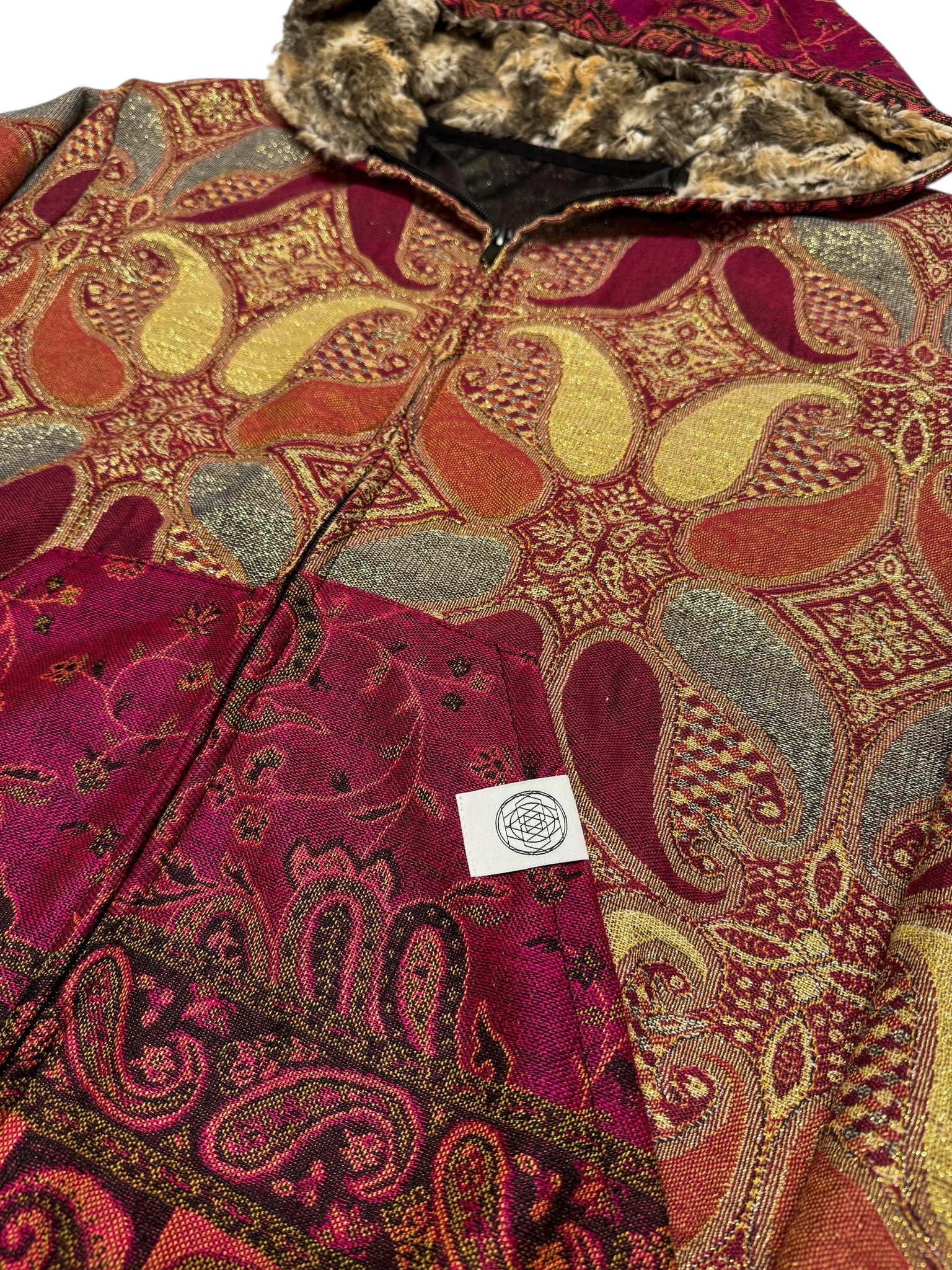 All of our pashmina hoodie are one of a kind or limited edition. Made with our PashTek backing for added strength. Each hoodie has a zip up front and plush fur lined hood.