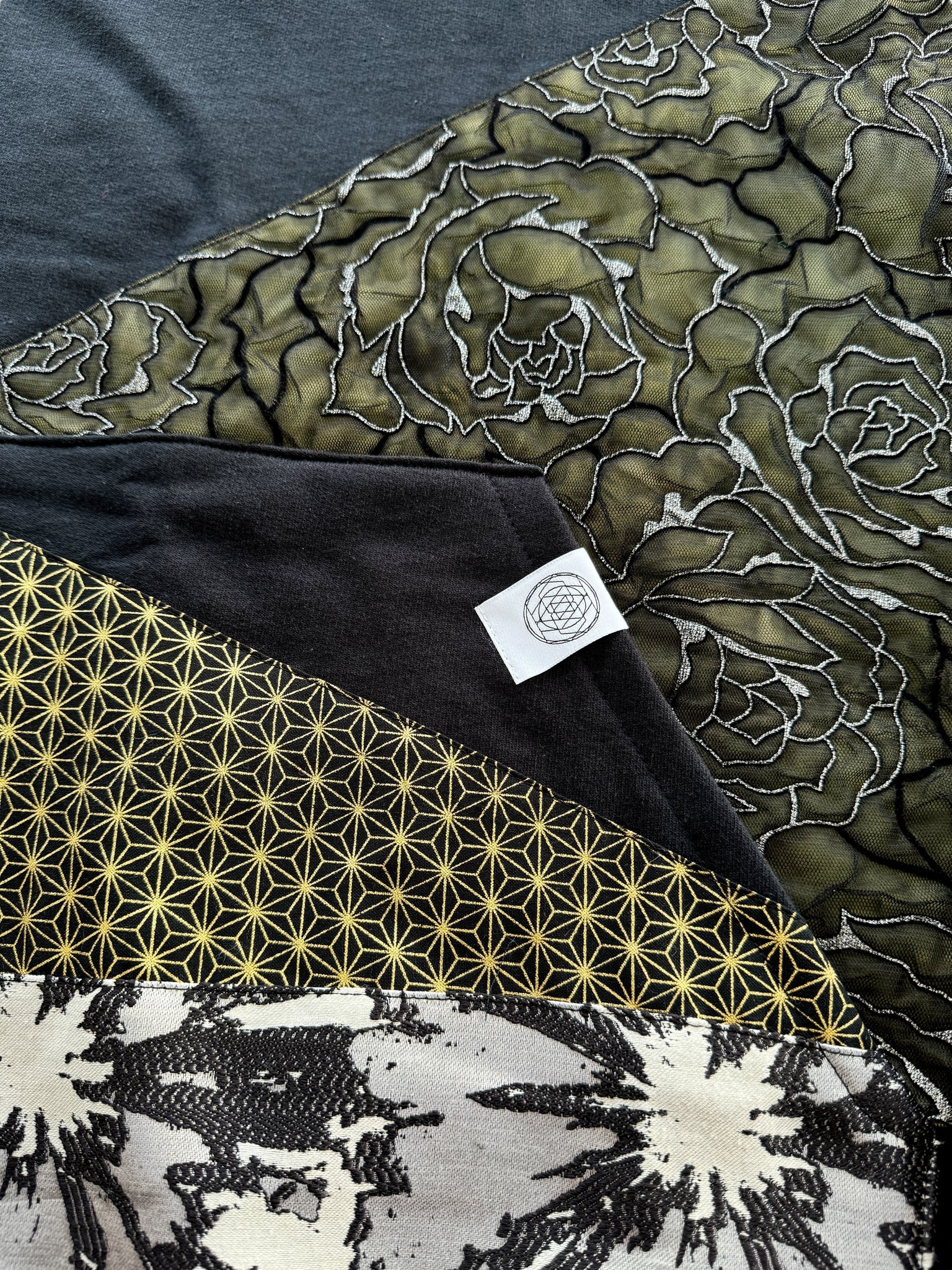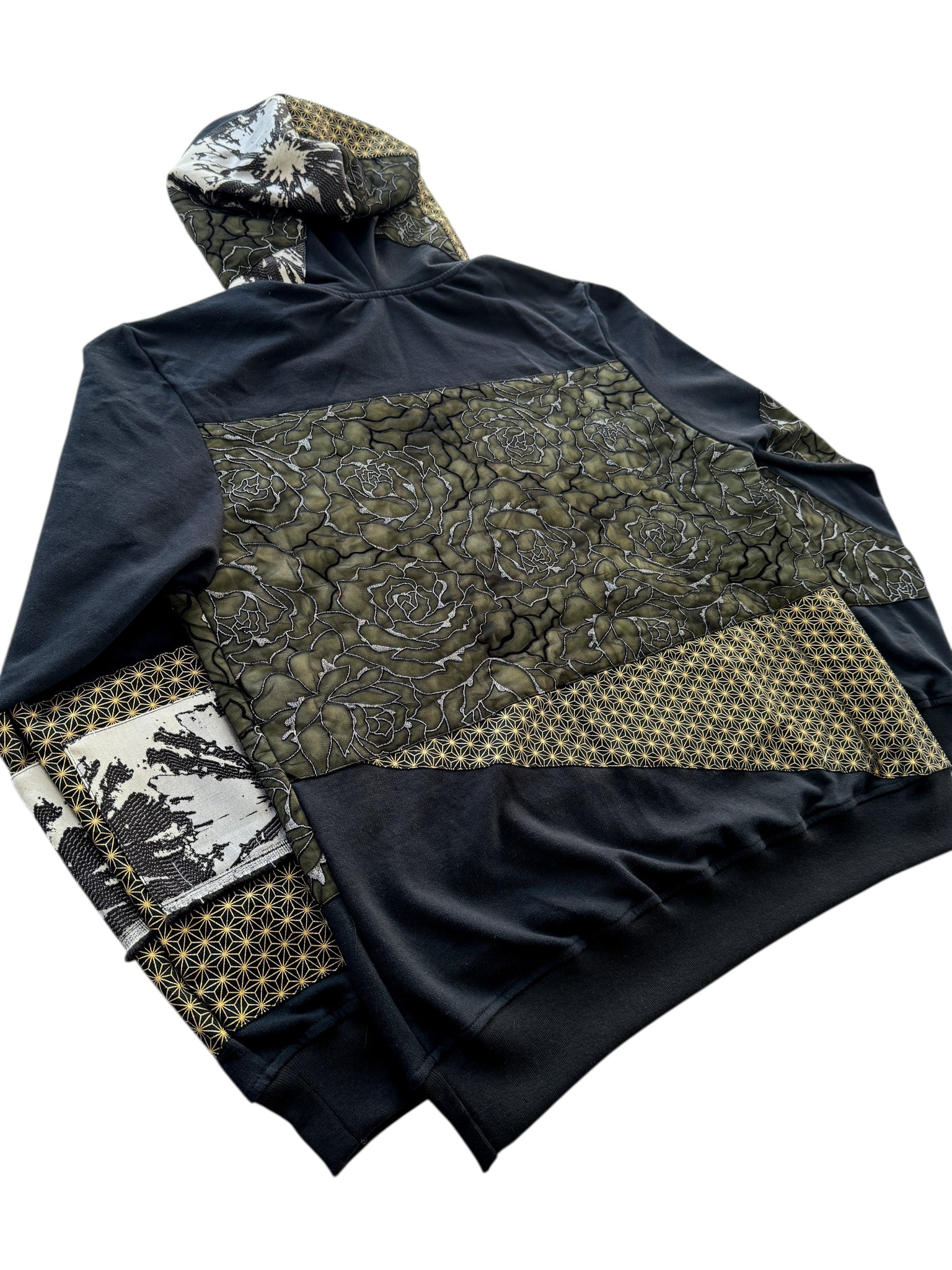 One of a kind Flora Lord Hoodie crafted from a 100% black cotton base with a patchwork design featuring black and gold Asanoha, green and silver metallic florals, and a silver floral blast. Finished with a fur lined hood, large hand pocket, and black ribbed bottom and wrist.