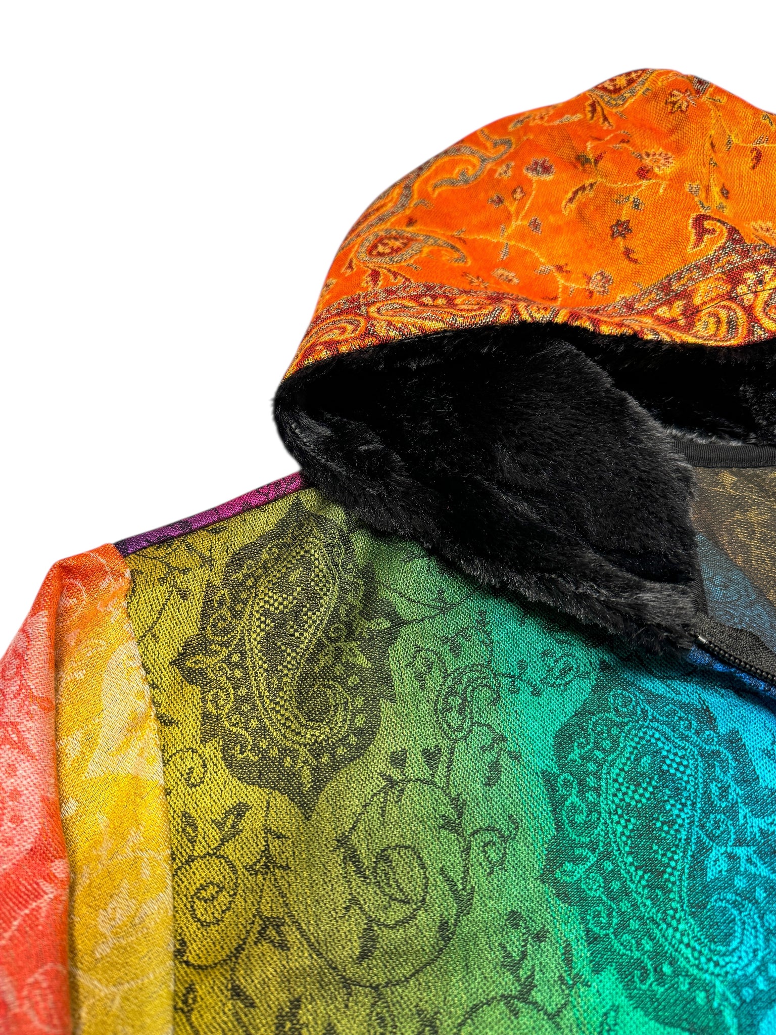 All of our pashmina hoodie are one of a kind or limited edition. Made with our PashTek backing for added strength. Each hoodie has a zip up front and plush fur lined hood.